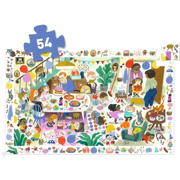 Un puzzle observation de 54 pièces pour découvrir la fête d’anniversaire organisée à l’occasion des 5 ans de Jenny. L’enfant crée son puzzle puis s’amuse à retrouver dans l’image les éléments de la frise.