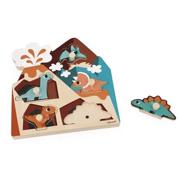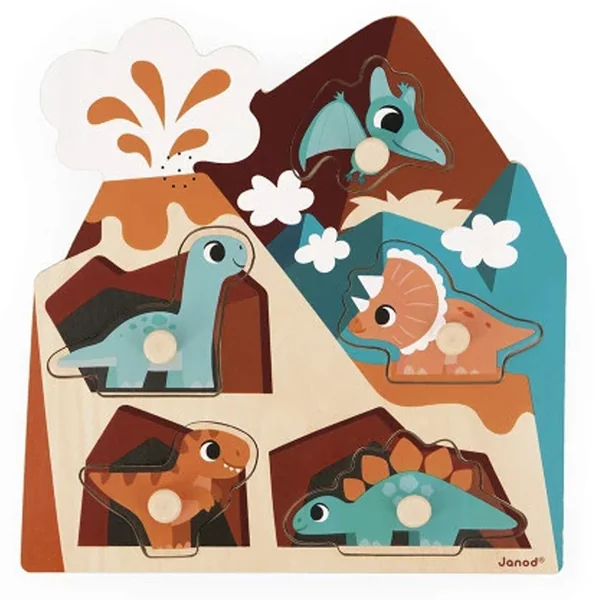 Chaque pièce représente un dinosaure : Tyrannosaure, Diplodocus, Tricératops, Ptéranodon et Stégosaure. Une fois la pièce correctement placée, il suffit d’appuyer pour entendre le cri du dinosaure correspondant. Une activité ludique qui plonge l’enfant dans un univers fascinant, peuplé de créatures préhistoriques et d’un volcan en éruption !