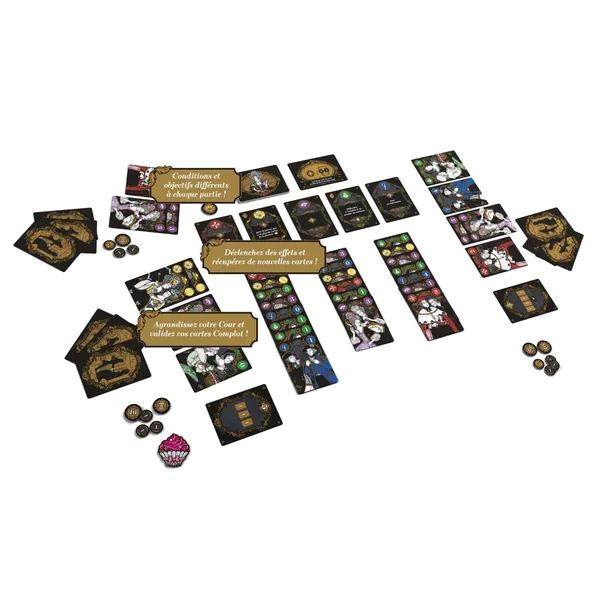 L’objectif est de marquer le plus de points d’influence selon les cartes Exigence et Condition retournées lors de la mise en place ainsi qu’avec les cartes Complot validées en cours de partie.