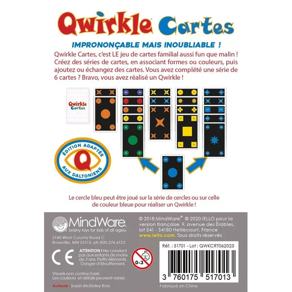 Qwirkle Cartes est un jeu de cartes familial, de 2 à 4 joueurs, dès 8 ans, pour des parties d’environ 20 minutes. Réalisez le plus de Qwirkles possible ! Un Qwirkle est une série de 6 cartes dont les symboles présentent tous soit la même forme, soit la même couleur/le même nombre de pastilles, sans aucun doublon.