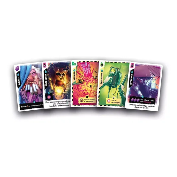 La principale ressource du jeu est l’eau. Vous la dépenserez pour jouer des personnages et des événements, et pour utiliser les capacités des cartes que vous avez déjà sur la table. Les personnages protègent vos camps et fournissent des capacités utiles, tandis que les événements sont des effets puissants qui prennent du temps pour porter leurs fruits.