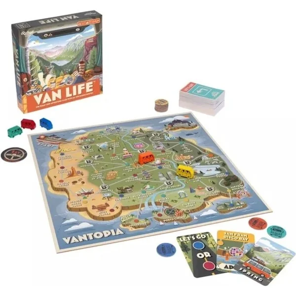 - comprend 10 cartes de vie, 50 cartes « Allons-y ! », 50 cartes d’aventure, 10 cartes de voyage, 10 jetons de roulotte, 1 jeton de premier joueur, 5 figurines de roulotte et 1 plateau de jeu