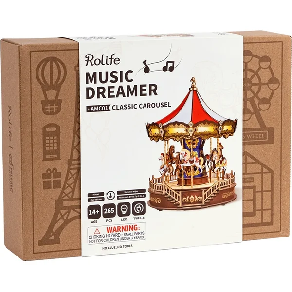 Assemblez votre boîte à musique – un manège classique avec un toit rouge et blanc et rappelez-vous ces moments heureux. Le manège est conçu dans les moindres détails, il est propulsé par un petit moteur, tourne et dispose d’un éclairage LED.