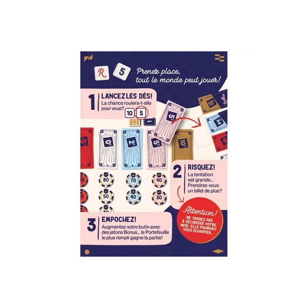 Roulez les dés, ramassez des billets et tentez de remporter des jetons Bonus pour être couronné le joueur le plus prospère. Tout ça en évitant les Krachs !