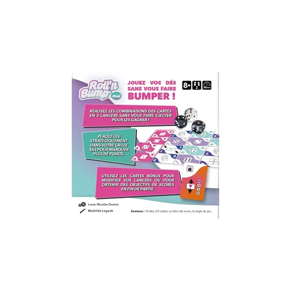 Roll’N’Bump Duel inclut : 10 dés, 53 cartes, un bloc de score, la règle du jeu