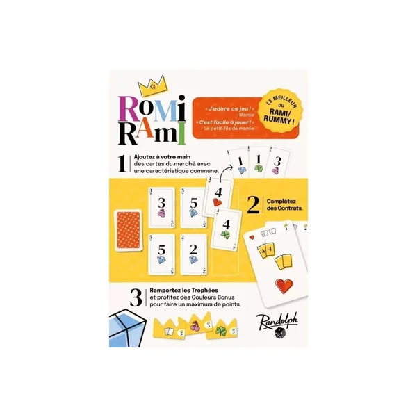 Romi Rami est un jeu de cartes, accessible dès l’âge de 8 ans, pour des parties de 30 minutes environ et jouable de 2 à 4 ans. Il est édité par Randolph.