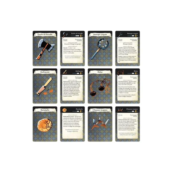 Explorez un arsenal varié avec ce deck de 55 cartes entièrement illustrées, mettant en vedette des armes telles que les grenades à salamandre, les arbalètes de poignet et les lames brise-épée.