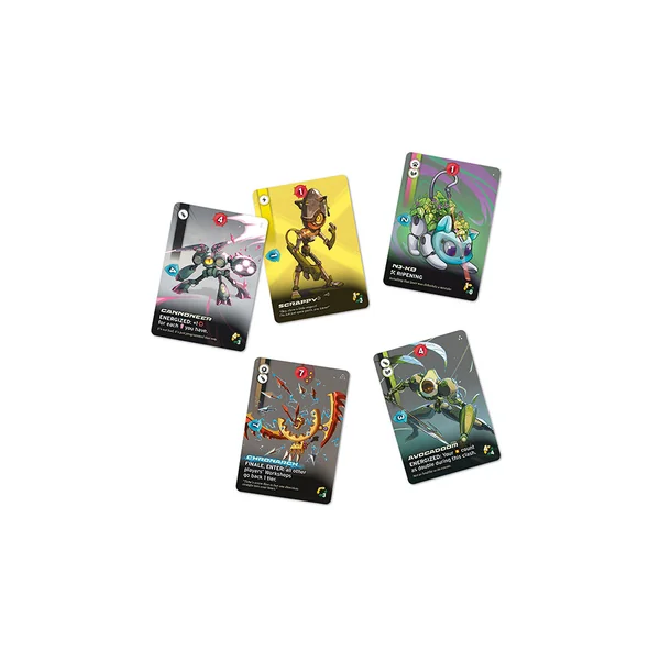 • Lors de la phase de Construction, vous assemblez de nouveaux Bots, que vous ajoutez à votre deck. Choisissez des Bots synergiques, recyclez les unités obsolètes, montez en niveau pour construire des machines toujours plus puissantes, ou tentez votre chance avec une stratégie agressive mais risquée composée d’une armée d’automates simples.