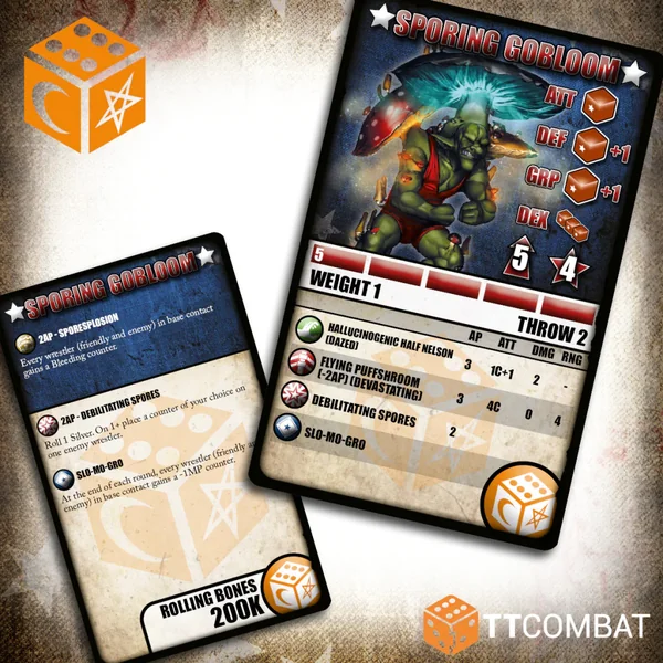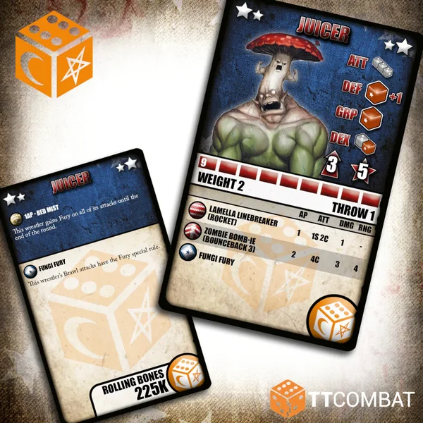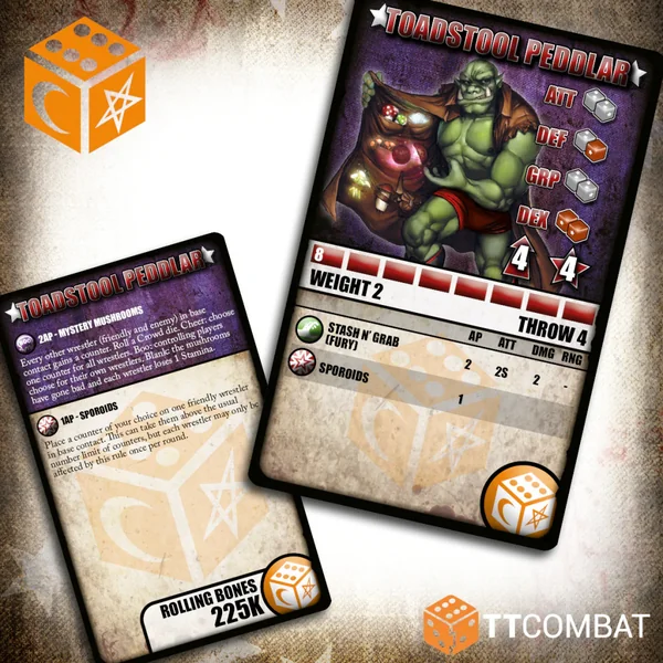 Le vendeur de crapauds est un orque méchant qui n’aime rien tant que de vendre des champignons améliorant les performances pour booster les lutteurs amis – les champignons sont assez délicats, alors ne soyez pas surpris si quelque chose tourne mal ! Un Juicer est un orque qui a consommé un champignon de trop et qui en a pris le contrôle ! C’est un petit champignon en colère qui ne pense qu’à se battre et ne se soucie guère de se défendre.
