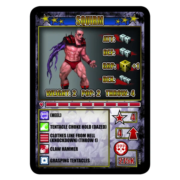 La capacité de grappin « Tentacle Choke Hold » de Squirm, créé des étourdissements. Mais vous ajoutez le Poids du lutteur ciblé à votre score GRP, ce qui signifie que plus il est gros, plus il tombe fort ! Et je ne vais même pas faire un nouveau paragraphe avant de vous dire que son « Crowd Pleaser » fait « Knockdown » à TROIS lutteurs dans un rayon de TROIS carrés.