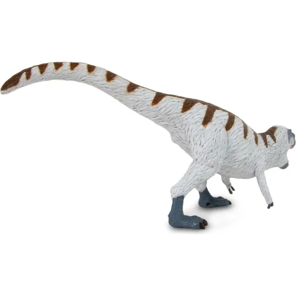 Cette figurine de Nanuqsaurus a un pelage isolant en plumes sculptées et une pose dynamique. Sa peau exposée a une couleur bleu-gris mate et ses plumes sont blanches avec une bande brune sur le dos.