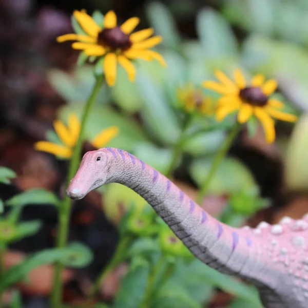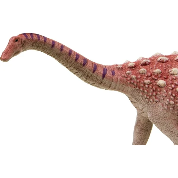 Cette figurine de Saltasaurus présente un travail détaillé et précis, mettant en avant son long cou, sa longue queue, ses pattes semblables à des troncs d’arbre et son corps recouvert d’ostéodermes osseux. Son corps est coloré en rougeâtre sur un fond gris avec des rayures violettes le long du cou et de la queue.