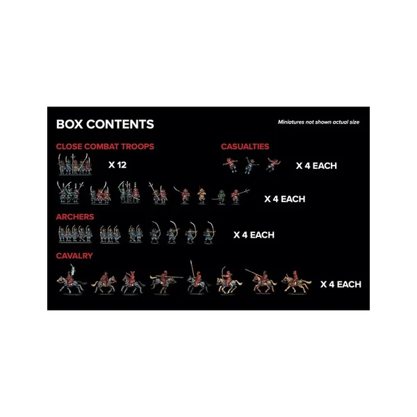 Cette boîte vous permet d’aligner jusqu’à 192 fantassins de 10 mm et 32 cavaliers équipés de yari (lance/pique), de naginata (bras armé), de yumi (arc long) et de katana (épée). Il y a également 12 figurines de blessés incluses, à utiliser comme base scénique ou comme marqueurs.