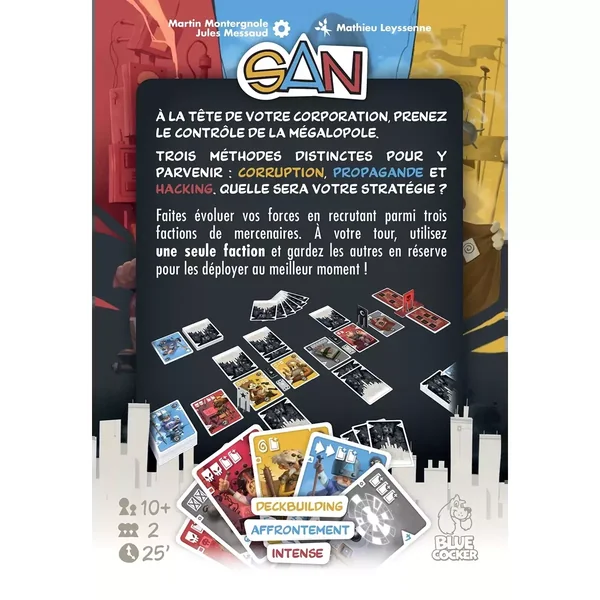 San est un jeu de société de stratégie initié jouable à 2 joueurs, dès 10 ans pour des parties d’environ 25 minutes, édité par Blue Cocker.