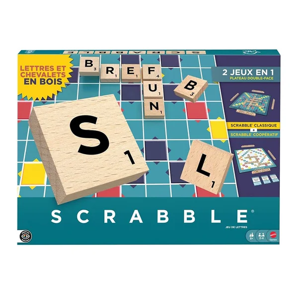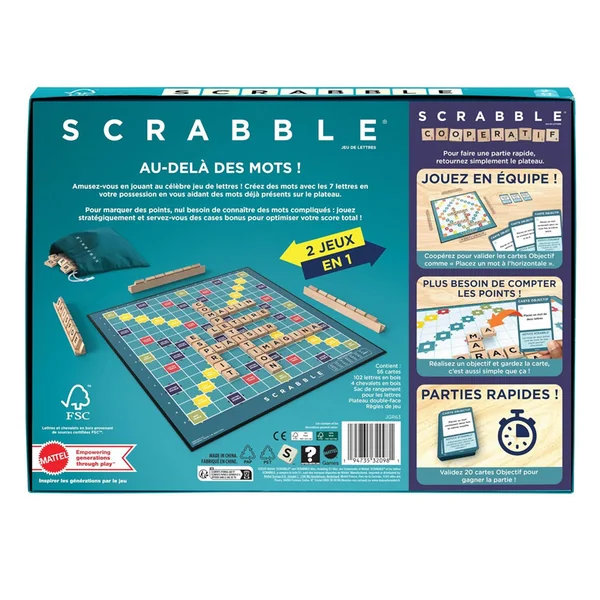 Les joueurs peuvent jouer au Scrabble® comme ils en ont l’habitude, en constituant des mots et en tentant d’améliorer leur score avec des bonus Lettre Double ou Mot Triple. Ou ils peuvent retourner le plateau et s’essayer à Scrabble Together, un jeu simple et rapide dans lequel les joueurs coopèrent pour relever des défis autour des mots. Deux jeux tout aussi AMUSANTS pour les joueurs de longue date que pour les débutants ! Ce jeu de scrabble est un 2 en 1 avec son plateau réversible. Pour un jeu classique on choisit le recto et pour les challenges coopératifs le verso.