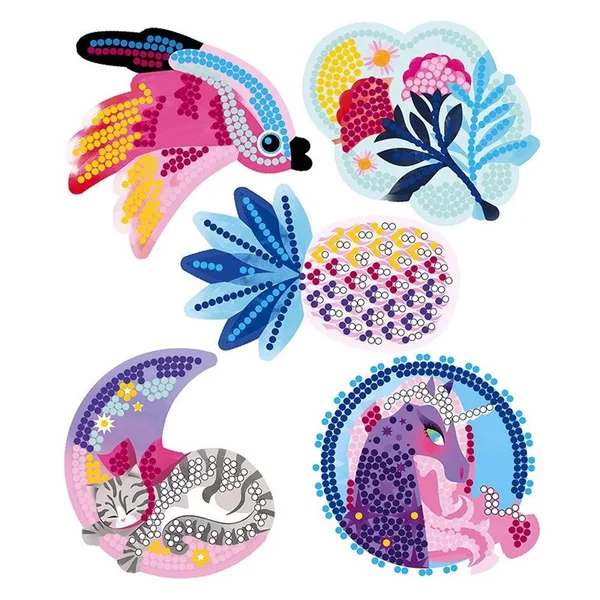 Une activité nouvelle sur le marché sous cette forme. Contenu : 5 décos autocollantes à compléter avec 1500 mini-strass, 5 rubans.