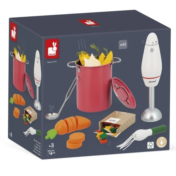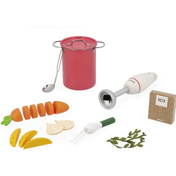Ce set se compose de 43 accessoires : une marmite et une louche en métal, un blender pour mixer les légumes, 6 morceaux de carotte, 2 oignons, 3 morceaux de pommes de terre et un poireau en bois, 3 brins d’aromates en tissu et 24 petites pâtes colorées rangées dans leur boite en carton. Parfait pour composer un grand nombre de soupes en s’adaptant au goût de chacun !