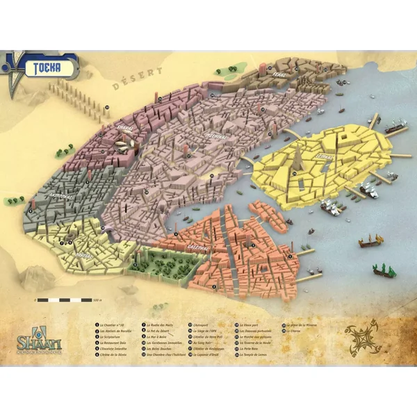 - Un poster recto verso 80 x 55 cm avec la carte de la région de l’Akeneï et le plan de Toeka, la cité aux mille ports.