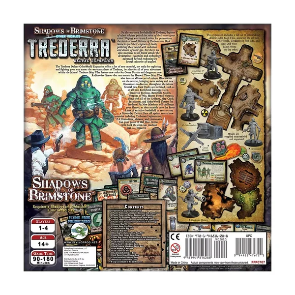 Cette extension Deluxe OtherWorld Shadows of Brimstone : Trederra comprend une multitude de nouveaux ennemis dangereux à rencontrer, notamment : 6 légionnaires Trederran – des soldats extraterrestres engagés dans la cause de « gagner la guerre » pour leur nation et armés d’armes mortelles en pierre noire pour accomplir leur travail, 3 grands Grenadiers Z-4 – Des soldats de démolition lourdement blindés, immunisés contre toutes les attaques sauf les plus puissantes et armés de charges thermiques terrifiantes, 6 Trederran Mutants – Des soldats qui ont succombé aux radiations corruptrices de la pierre noire et qui ne sont plus que des sauvages vicieusement stupides, et 3 lieutenants Trederran – des officiers impitoyables qui commandent leurs légions d’une main de fer.