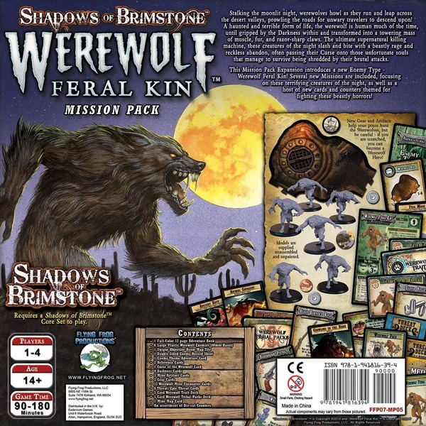 Shadows of Brimstone : Werewolf Feral Kin – Mission Pack comprend toutes les figurines, les règles et une grande quantité de nouvelles cartes pour ajouter ces nouveaux ennemis à vos parties de Shadows of Brimstone, ainsi qu’une mini-campagne de 4 missions, sur le thème de ces nouveaux ennemis (ces missions peuvent également être facilement joué comme des aventures uniques, ajoutant une grande rejouabilité).