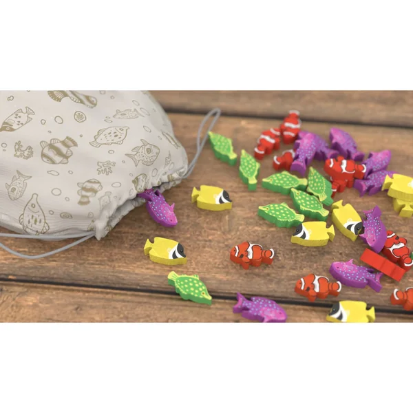 Le but de Shallow Sea est d’avoir le plus de points à la fin de la partie. À votre tour, vous choisissez une combinaison d’un poisson et d’une tuile adjacente. Placez les deux sur un espace vide de votre plateau océan. Lorsque des poissons de la bonne couleur se rassemblent autour d’une tuile corail, le corail est terminé et la tuile est retournée. Les coraux terminés deviennent le refuge des poissons, vous devez donc choisir tactiquement quels poissons vont habiter le corail.
