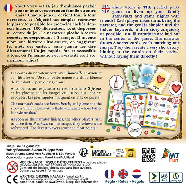 Short Story est le jeu d’ambiance parfait pour animer vos soirées en famille ou entre amis ! Chaque joueur devient tour à tour narrateur, et l’objectif est simple : retrouver le plus vite possible les mots-clés cachés dans son histoire. 100 illustrations sont disposées au centre du jeu. Le narrateur pioche 3 cartes secrètes correspondant à 3 images. Il invente alors une histoire ultra-courte, en suggérant les mots des cartes… sans jamais les dire directement !