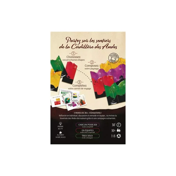 À chaque tour, choisissez une carte, soit pour l’ajouter au Paysage commun à votre groupe, soit à votre Carnet de voyage. Le joueur avec le plus de points remporte la partie. Pour avoir été de bons coéquipiers, le reste de l’équipe gagne un bonus permettant peut-être à toute l’équipe de partager la victoire !