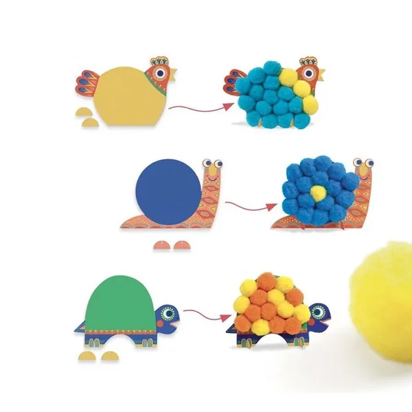 Une activité de collage pour compléter les 3 animaux avec de gros pompons. En suivant les modèles du livret explicatif, l’enfant colle les gros pompons colorés sur les parties autocollantes des 3 animaux. Surprise, 3 animaux tous doux à caresser apparaissent !