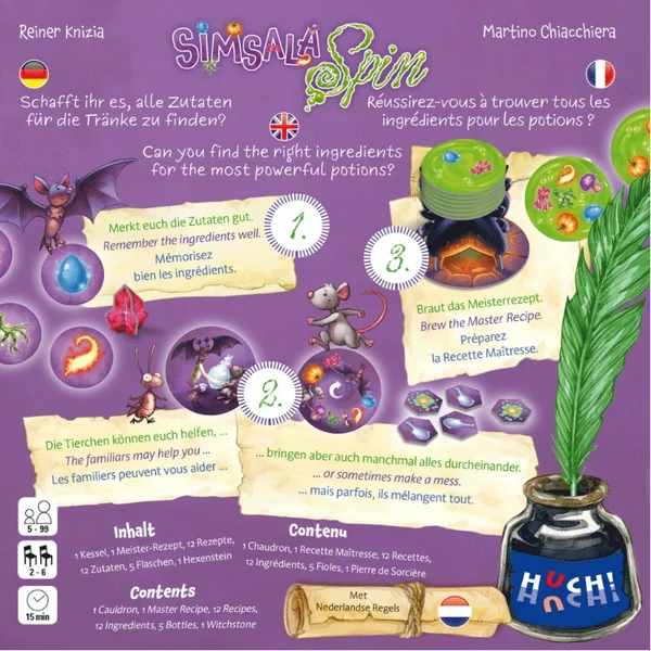 Entrez dans le laboratoire mystique de l’école Witchstone et devenez maître dans l’art des potions ! Dans Simsala Spin, vous devrez unir vos forces, faire preuve de mémoire et de stratégie pour retrouver les bons ingrédients cachés autour du chaudron. Chaque bonne pioche vous rapproche de la réussite… mais attention aux erreurs : un ingrédient incorrect, et la potion pourrait bien exploser !