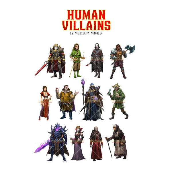12 figurines de taille moyenne :Brute, Escroc, Marchand corrompu, Chevalier de la mort, Grand-mère maléfique, Roi maléfique, Prêtre maléfique, Reine maléfique, Sorcier maléfique, Savant fou, Séductrice, Tueur en série.