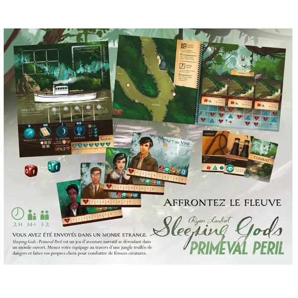 Primeval Peril se déroule sur une rivière dangereuse qui serpente à travers une jungle luxuriante. Il inclut de nouveaux personnages et de nouvelles histoires afin de ne rien gâcher du jeu de base Sleeping Gods. Cette édition issue d’un print & play imaginé par l’auteur a été revue et augmentée avec de nouvelles histoires et quêtes, un gameplay simplifié et un atlas avec de nouvelles cartes !
