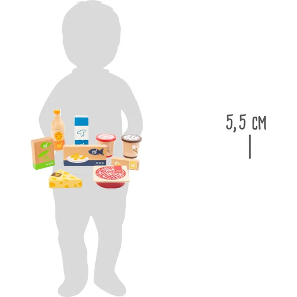 Les courses hebdomadaires seront un jeu d’enfant grâce à ce set ! Vous y trouverez du jus d’orange, deux paquets de glace, un paquet de petits pois, des bâtonnets de poisson, du beurre, du fromage, de la salami tranchée et une boîte de lait. Ce set de 9 pièces répondra à tous vos souhaits ! Les enfants s’amuseront vraiment avec ce set. D’abord, ils « font les courses » puis rangent les aliments dans leur cuisine d’enfant ou leur stand de vente. Le jouet présente un design naturel associé à des illustrations élégantes et est fabriqué en bois solide (ce qui promet une qualité durable).