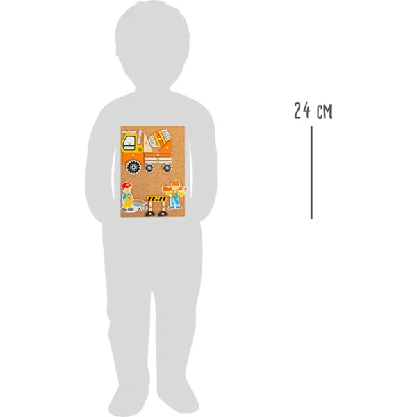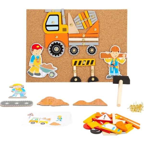 - Dans l’emballage, vous trouverez un tableau en liège, un marteau, des punaises et des objets en bois de différentes formes.