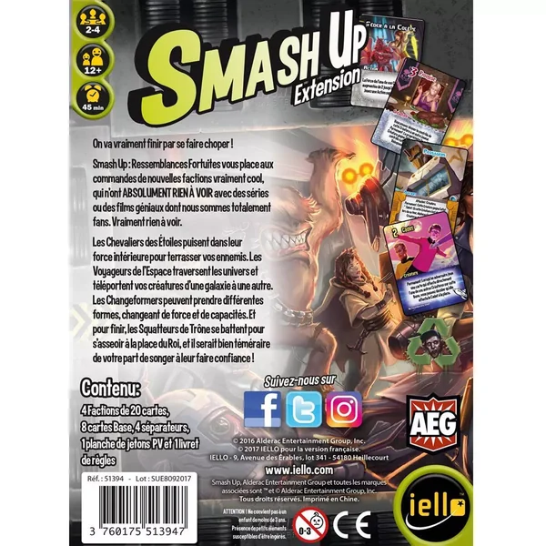 Smash Up : Ressemblances Fortuites ! : Une nouvelle extension pour le cultissime Smash Up, jouable pour des parties à 2 joueurs, avec des factions qui vont vous rappeler quelque chose :