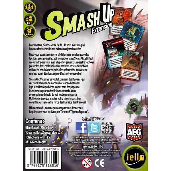 Smash Up: Vous l’aurez voulu ! contient des Requins, qui ont bien l’intention de mâchouiller leurs adversaires. Il y a aussi les Superhéros, volant hors des pages de leurs comics pour anéantir leurs ennemis. Vous avez également choisi de voir les Légendes de la Mythologie Grecque envahir votre table, impassibles devant la puissance et la force destructrice des Dragons !