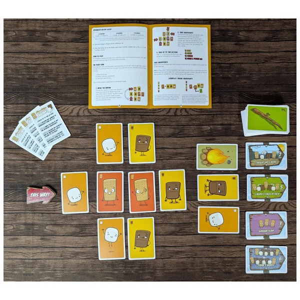 Dans S’mores Galore, les joueurs s’affrontent pour marquer le plus de points possible. Vous marquez des points en préparant des s’mores. Pour cela, vous devez d’abord prendre des cartes biscuits Graham, chocolat et guimauve sur une grille posée sur la table.