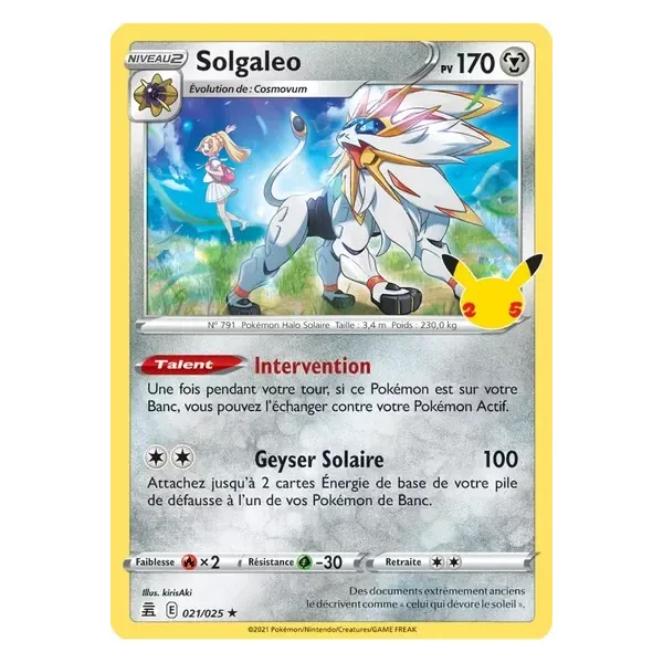 Découvrez Solgaleo (cel021), une carte Pokémon de l’extension Célébrations, provenant du bloc Épée & Bouclier. Idéale pour compléter votre collection, cette carte Holo Rare plaira autant aux collectionneurs qu’aux joueurs.
