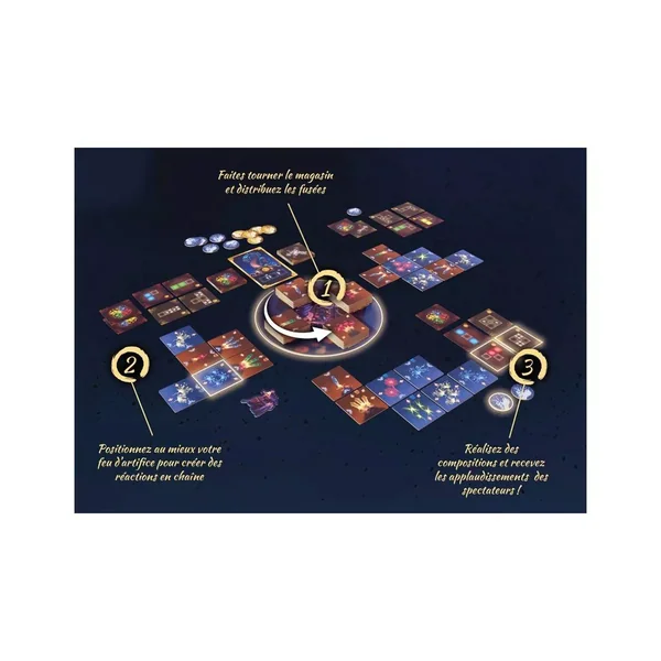 Dans Spring Festival, chaque joueur devra placer son feu d’artifice du mieux possible pour créer des réactions en chaîne et faire exploser un maximum de fusées. Il créera ainsi des compositions de forme ou de motif et remplira ses objectifs.