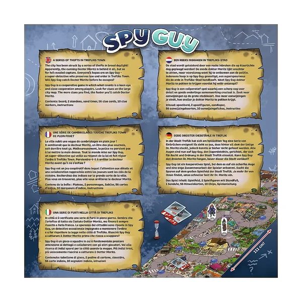 Une série de vols en plein jour a eu lieu à Treflikowo ! On dit que le sournois Docteur Mortiz est derrière tout cela, mais jusqu’à présent, il n’a pas été attrapé. Incarnez Spy Guy, un super détective qui fait régner la loi et l’ordre dans la ville. Cherchez des indices sur un immense tableau de plus d’un mètre de long et essayez de rattraper le méchant avant qu’il ne s’échappe de Treflikow.