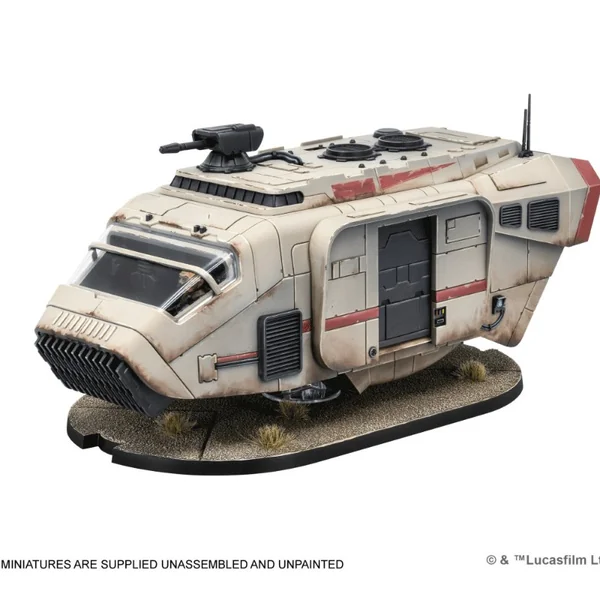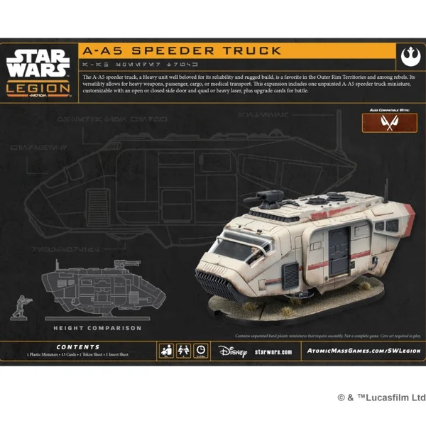 Robuste et fiable, le camion speeder A-A5 est très présent dans la Bordure Extérieure et fortement apprécié des Rebelles. Ce véhicule polyvalent peut être équipé d’armes lourdes, embarquer du personnel, de la marchandise ou du matériel médical. Cette extension contient une figurine de camion speeder A-A5 à peindre, que vous pourrez assembler avec la porte ouverte ou fermée et équiper d’un canon laser lourd ou d’un quadrilaser, ainsi que de nombreuses cartes Amélioration. Il est livré avec deux emplacements d’équipage et un emplacement de pilote : il devient un centre de commandement mobile avec Shriv Surgaav au volant. Figurine à monter et non peintes.