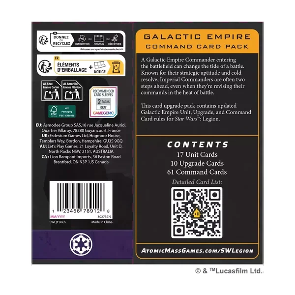 Star Wars : Légion – Galactic Empire est un Command Card Pack pour 2 joueurs, dès 14 ans et pour des parties d’environ 120 minutes, édité par Atomic Mass Games.