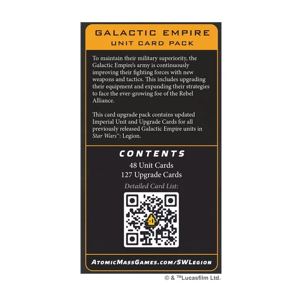 Le pack de cartes d’unité Galactic Empire contient les règles mises à jour des cartes d’unité et d’amélioration Galactic Empire pour Star Wars : Légion, comprenant : 48 cartes d’unité et 129 cartes d’amélioration.
