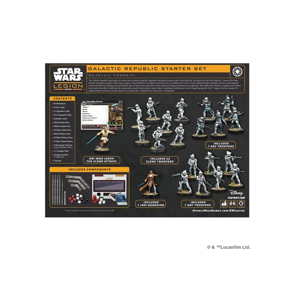 Le kit de démarrage de la République Galactique contient une armée de niveau Reconnaissance de 600 points et tous les dés, gabarits, outils et jetons dont un joueur a besoin pour commencer à jouer ses premières parties de Star WarsTM: Legion. Lorsqu’un joueur est prêt pour des parties encore plus importantes, ce kit de démarrage constitue un point de départ idéal pour agrandir et personnaliser ses armées avec des unités supplémentaires provenant d’autres boîtes d’unités Star Wars: Legion.