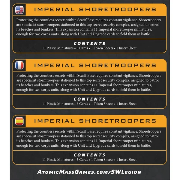 Protéger les innombrables secrets de la Base de Scarif exige une vigilance permanente. Les Shoretroopers sont des stormtroopers spécialisés qui ont été affectés à ce complexe de sécurité ultra-secret. Leur mission est de patrouiller sur les plages environnantes et d’inspecter les bunkers. Cette extension contient 11 figurines de Shoretrooper permettant de constituer 2 unités de soldats, ainsi que leurs cartes Unité et Amélioration.