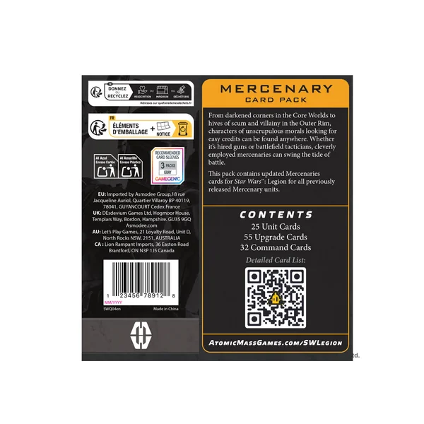- LIBÉREZ LA PUISSANCE DES MERCENAIRES : Le pack de cartes Mercenaires améliore votre jeu Star Wars: Legion avec des cartes Unité, Commandement et Amélioration spécifiques mises à jour pour les unités mercenaires déjà sorties.