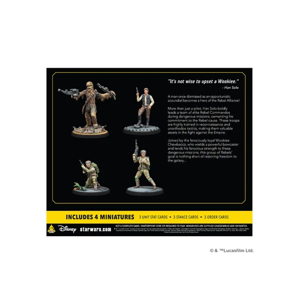 La canaille au cœur d’or devient un héros de l’Alliance rebelle ! Han Solo et l’inébranlable et féroce Chewbacca dirigent une équipe d’élite de commandos rebelles. Ces troupes sont hautement entraînées à la reconnaissance et aux tactiques peu orthodoxes, ce qui en fait des atouts précieux dans la lutte pour la liberté contre la tyrannie de l’Empire.