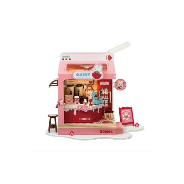 Voici une adorable maison rose ornée de nombreux éléments à base de fraises. La base et le comptoir de caisse évoquent du lait renversé, un élément amusant et créatif. Derrière le comptoir se trouve un meuble avec deux distributeurs de lait. On y trouve également un réfrigérateur grande capacité contenant divers laits. À travers la lucarne creuse, une lumière chaleureuse éclaire le toit.