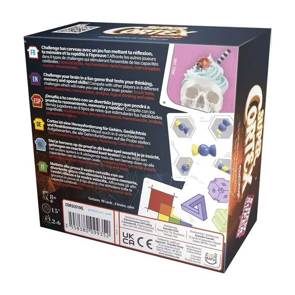 Super Cortex Challenge est un jeu de réflexion rapide qui met à l’épreuve votre cerveau sur 8 épreuves différentes, dont une olfactive. Un jeu pour les experts de Cortex Challenge. De 2 à 6 joueurs, 15 minutes, Asmodee.