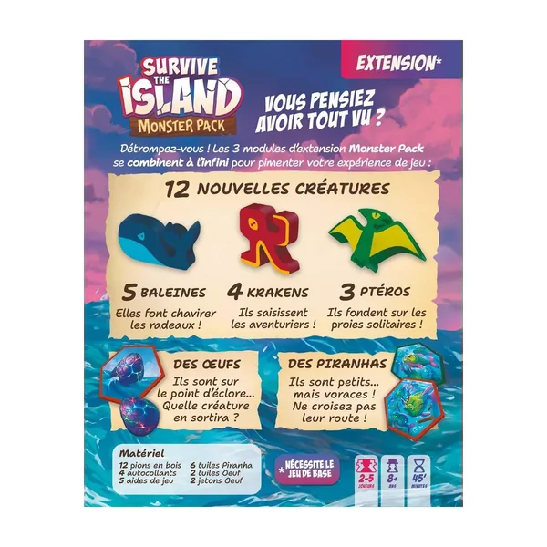 Survive the Island : Monster Pack est une extension jouable de 2 à 5 joueurs dès 8 ans pour des parties d’environ 45 minutes, édité par Zygomatic.