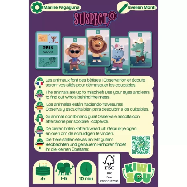 Suspecto est un jeu de société pour les enfants jouable de 1 à 5 joueurs, dès 4 ans pour des parties d’environ 10 minutes, édité par Kiwizou.